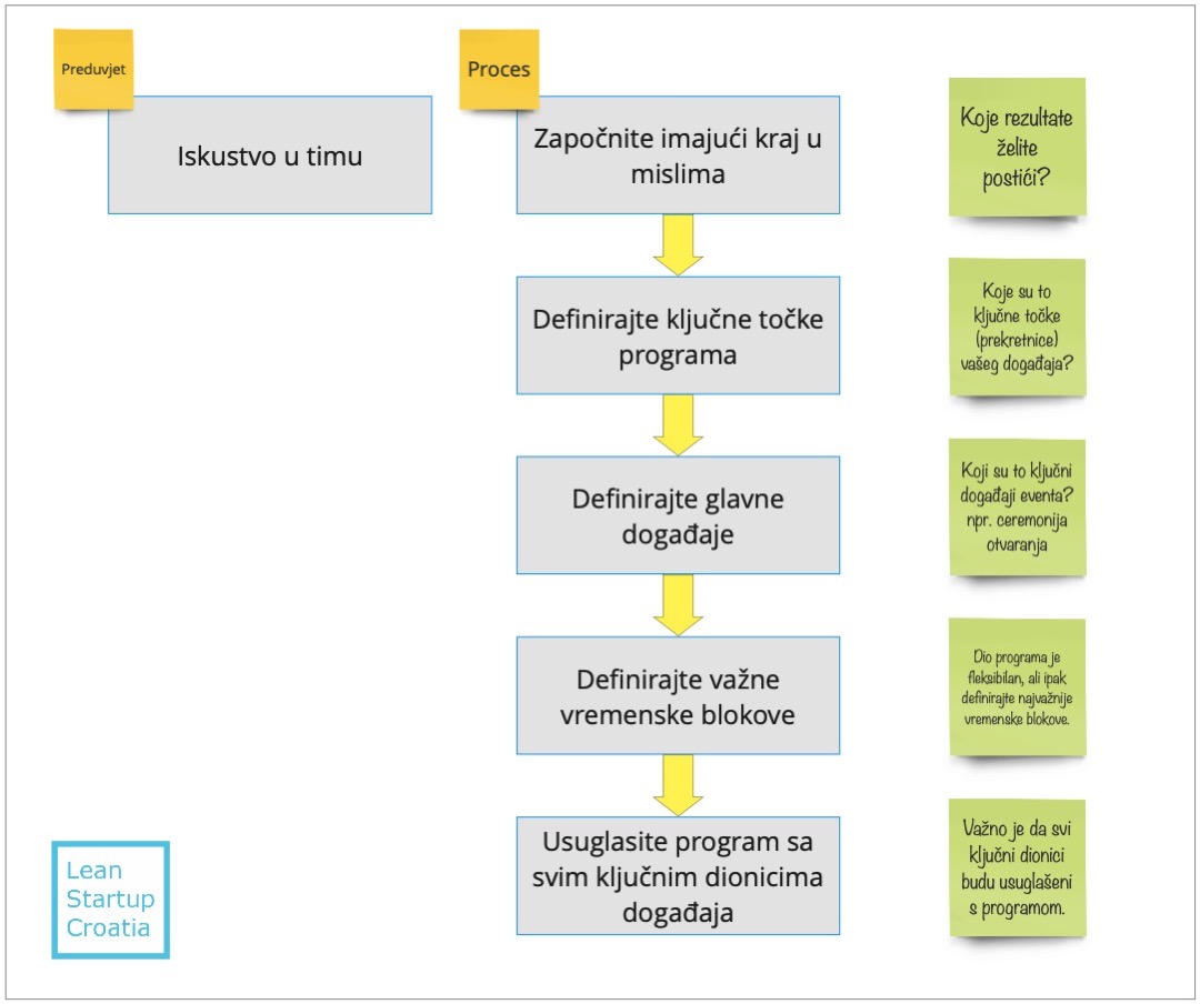 Kad smo u organizacijskom timu postigli dogovor oko rezultata, sljedeći korak je bio definiranje konkretnog rasporeda. Započeli smo, slijedeći proces prikazan na gornjoj slici, definiranjem ključnih točaka našeg događaja jer će se prema njima definirati ostatak rasporeda.
