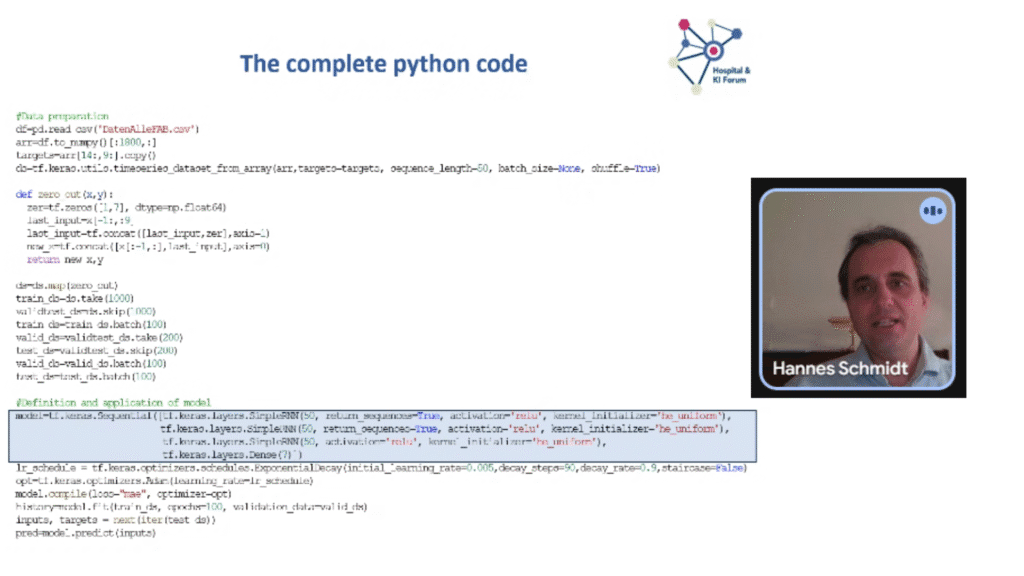 Glavni govornik, Hannes Schmidt iz Klinikon GmbH, predstavio je primjer jednostavnih neuronskih mreža koje analiziraju višegodišnje podatke o zauzetosti kreveta. Modeli su trenirani na pet godina podataka, uključujući dnevne i noćne brojke pacijenata, a u nekim su odjelima postigli pogrešku predviđanja od samo 3,85%.